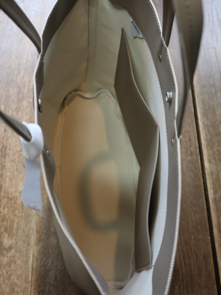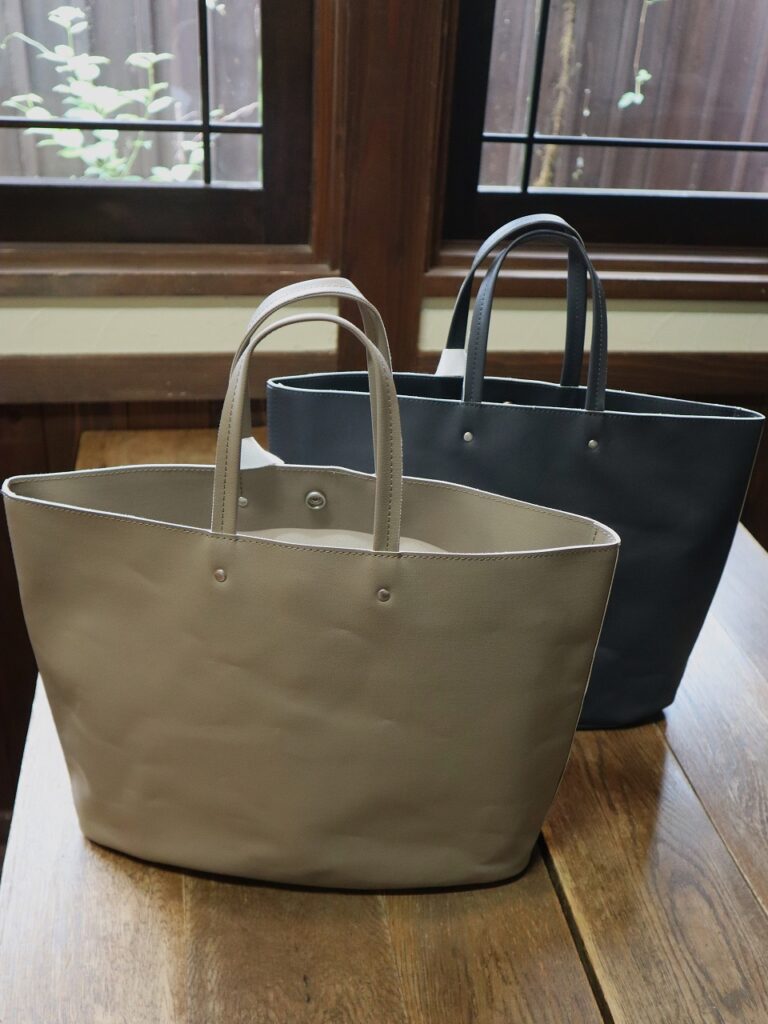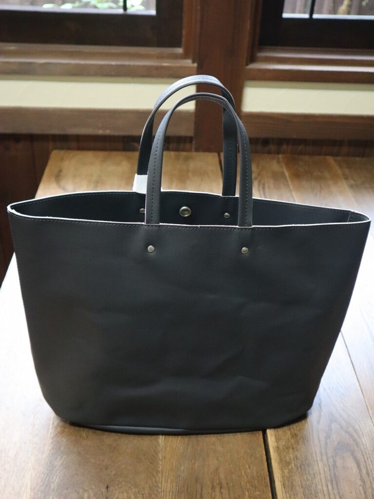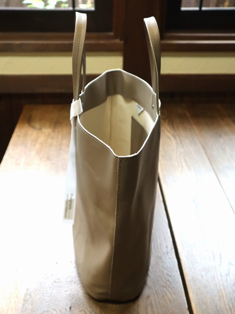8号帆布にオリジナルカラーのPVC+目出し加工を施したトートバッグ。内ポケット×2サイズ:H270×W335×D145mm素材:8号帆布(PVC加工)カラー:カフェオレ・チャコール