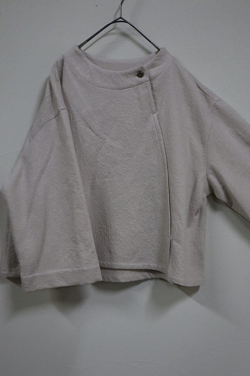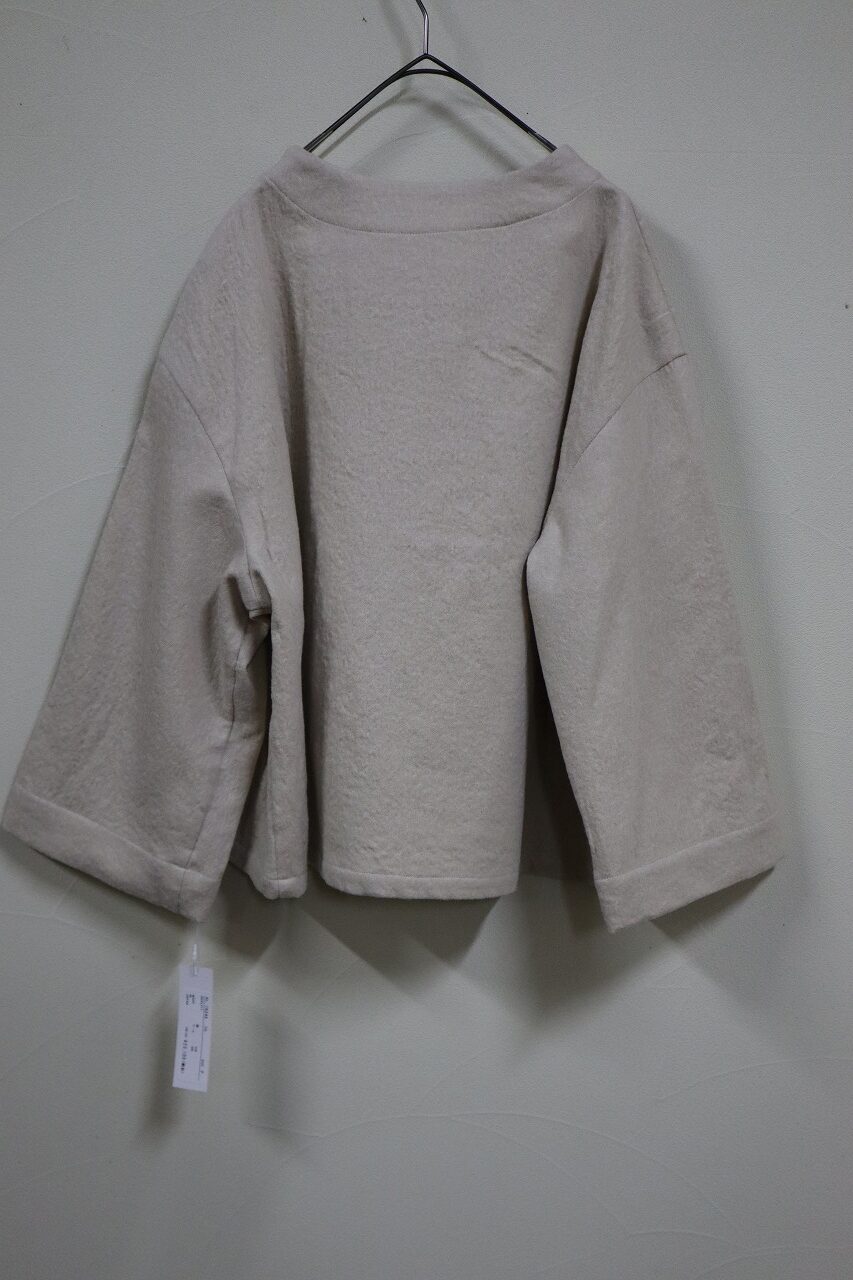 アシンメトリーな切替えが目を惹くプルオーバー。やや立った衿がエレガントな雰囲気にしてくれます。また開きすぎていないので上品な印象に。ボタンを一つ施すことでアクセントになりながらも着脱がしやすいようになっています。大胆に斜めに切替えたパネルとその先のスリットが着やすいシルエットなのにグッと目を惹き、スタイリングのアクセントになる一枚です。