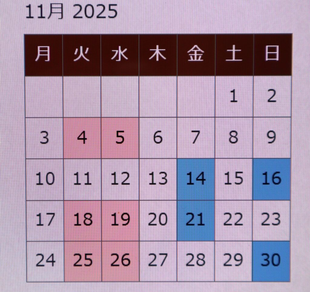 赤・・・定休日 青・・・臨時休業