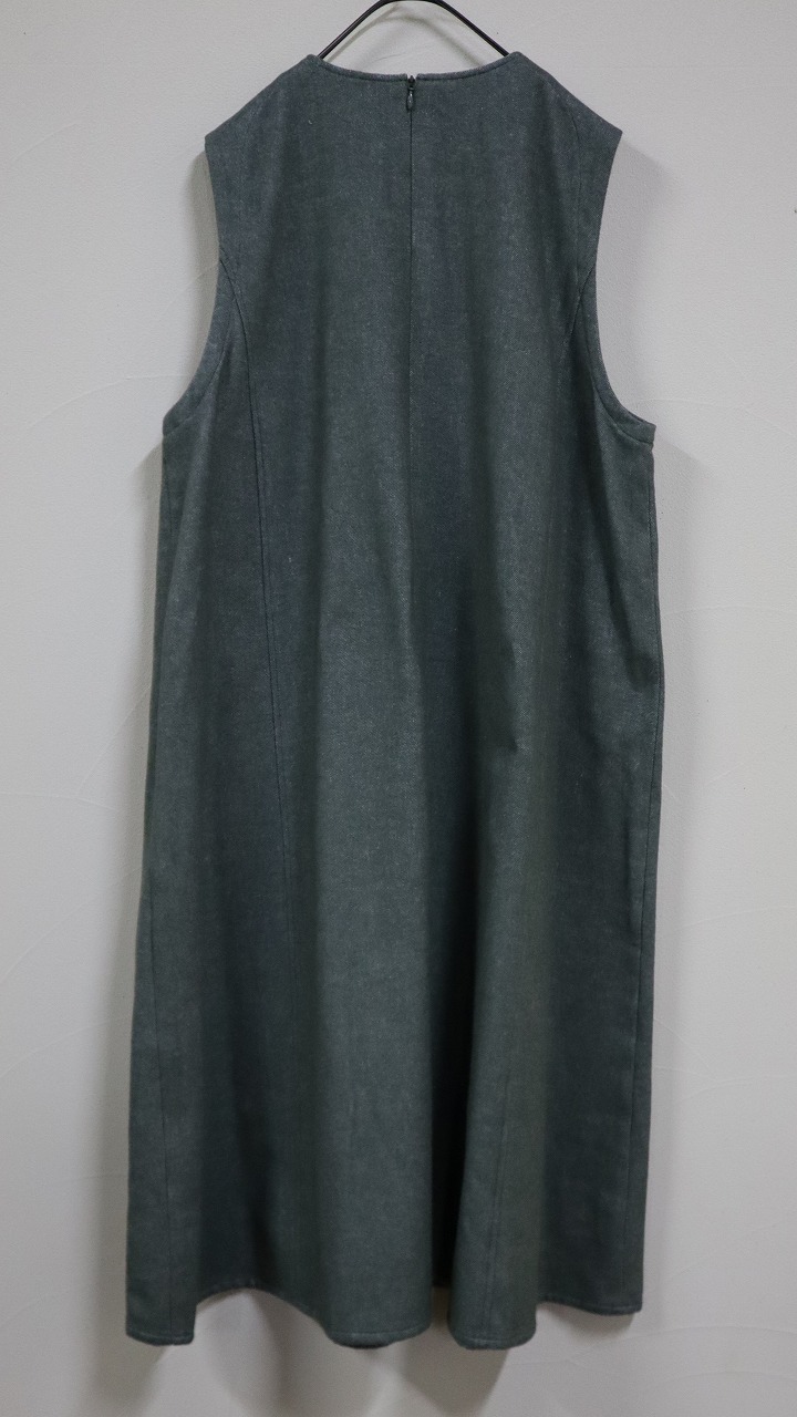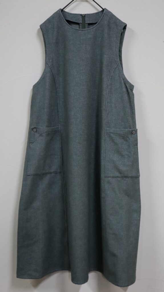Aラインシルエットのノースリーブワンピース。パネル切替え、アーム、ポケット口のステッチが大きな特徴で、パネルに挟み込んだポケットに大きめな釦を施しているのもこのアイテムのデザインポイントです。コンシールファスナー開きなので、パネル切替えに馴染んでバックスタイルもスッキリとした印象のノースリーブワンピースに仕上げてます。