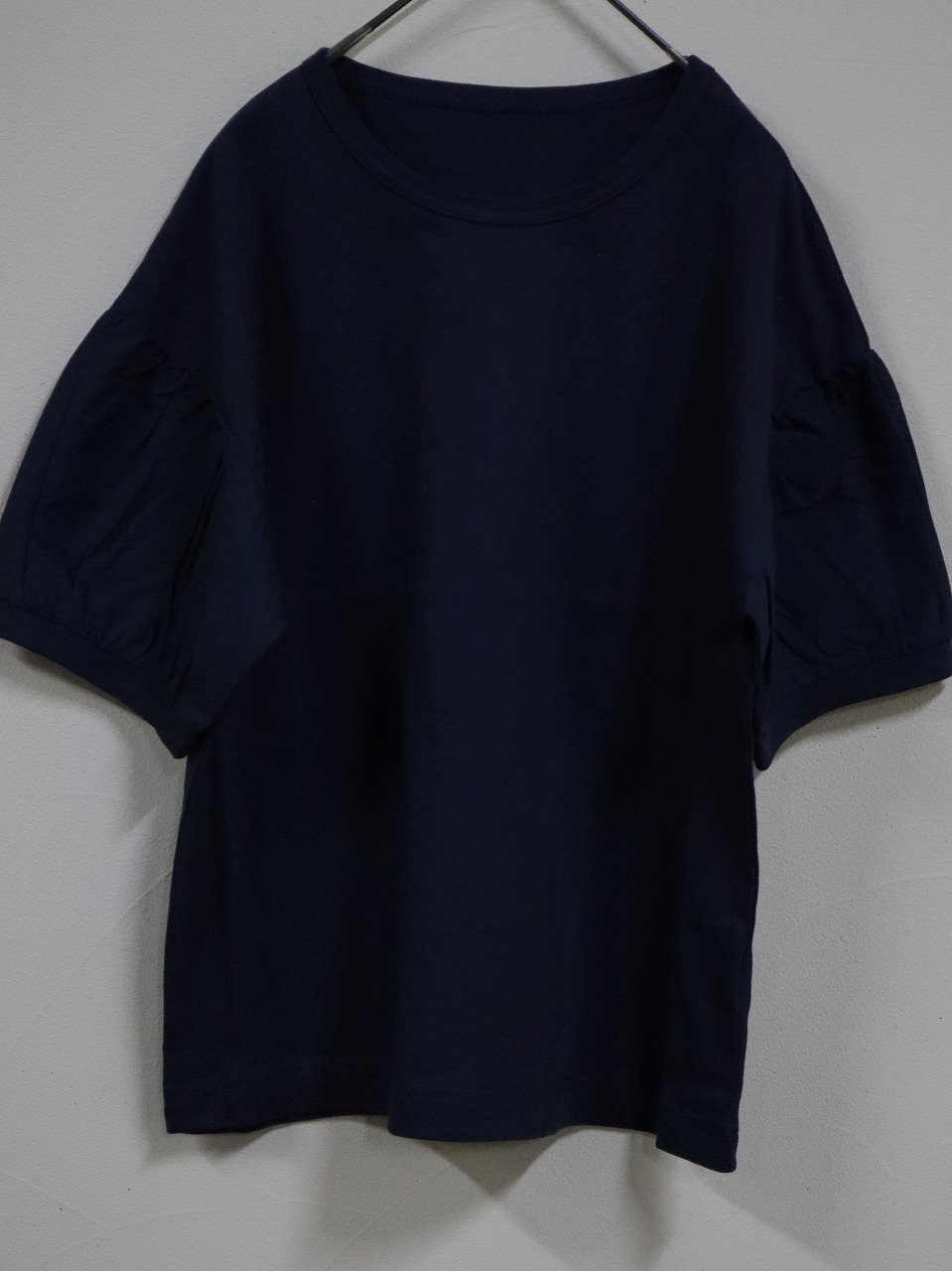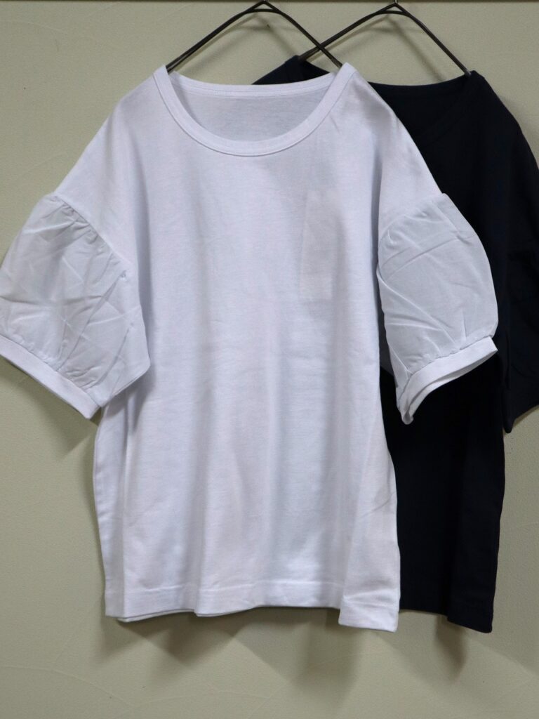 袖部分に同色の布帛素材を使用した異素材コンビTシャツ。