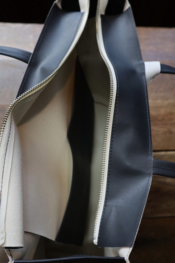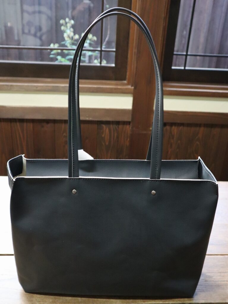 8号帆布にオリジナルカラーのPVC+目出し加工を施したトートバック。レザーのような表情感もあり普段使いはもちろんお仕事使いにもオススメ。